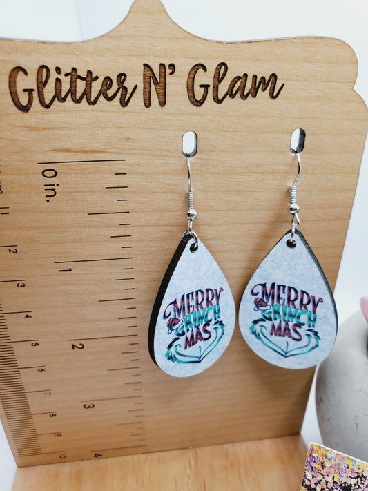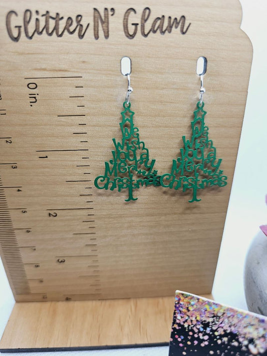 Glitter N Glam 1999 "We Wish You A Merry Christmas" Green Tree Dangle Earrings