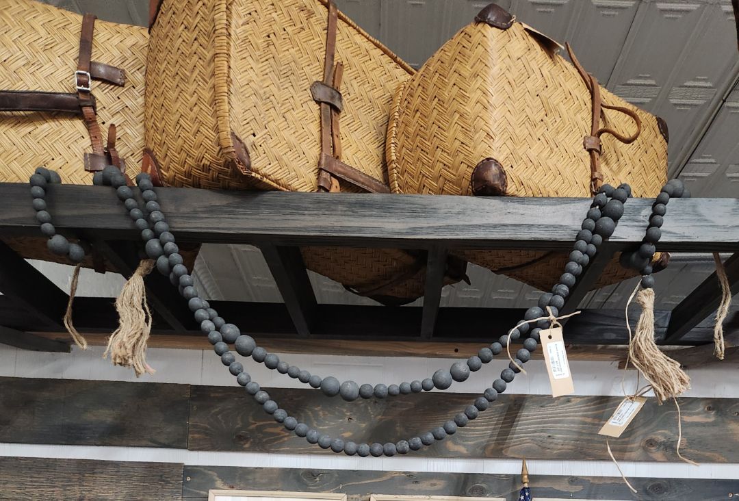 A garland of wooden black beads strung on twine. All beads are the v same size. Looks great hung up, put in a bowl or add to other decor for that extra touch of charm.