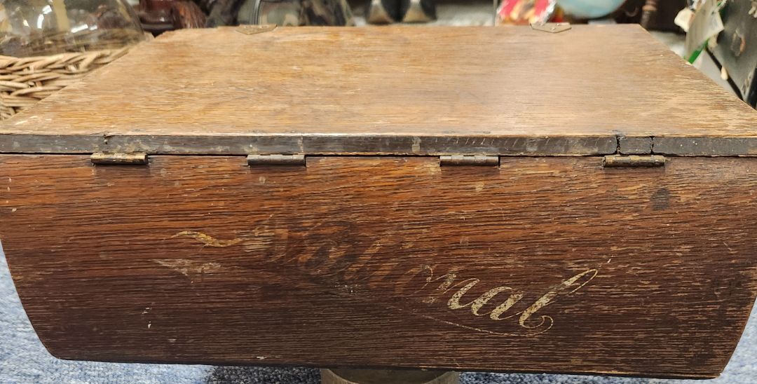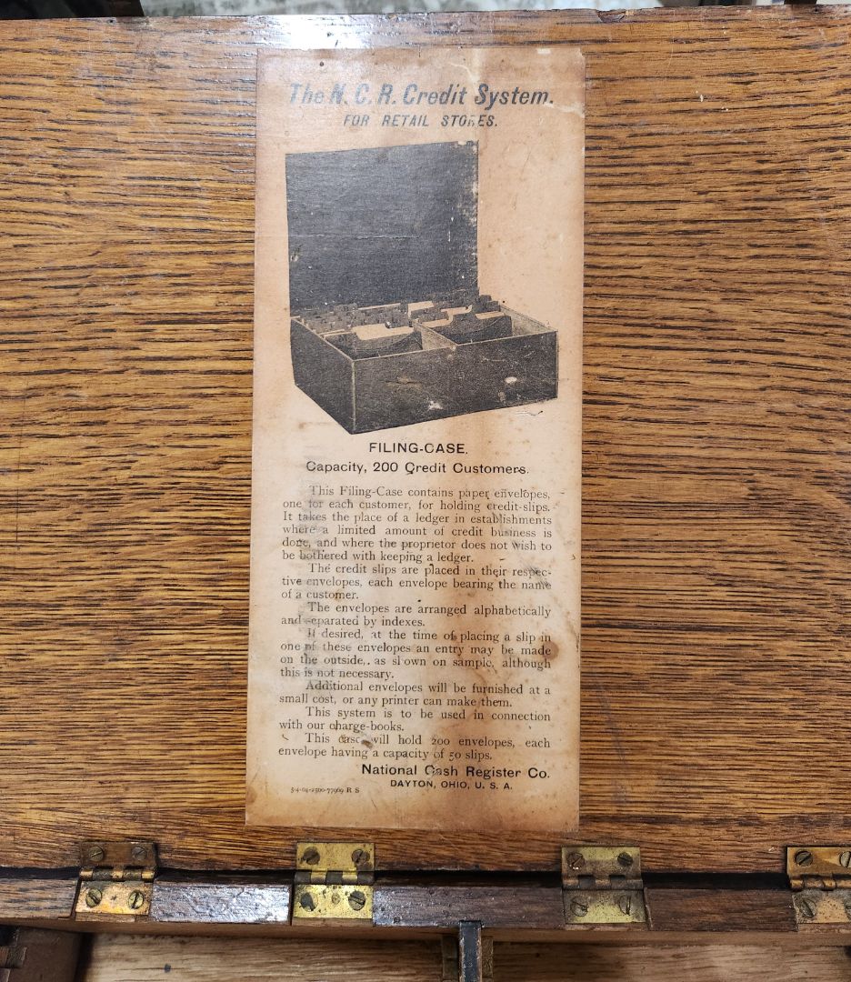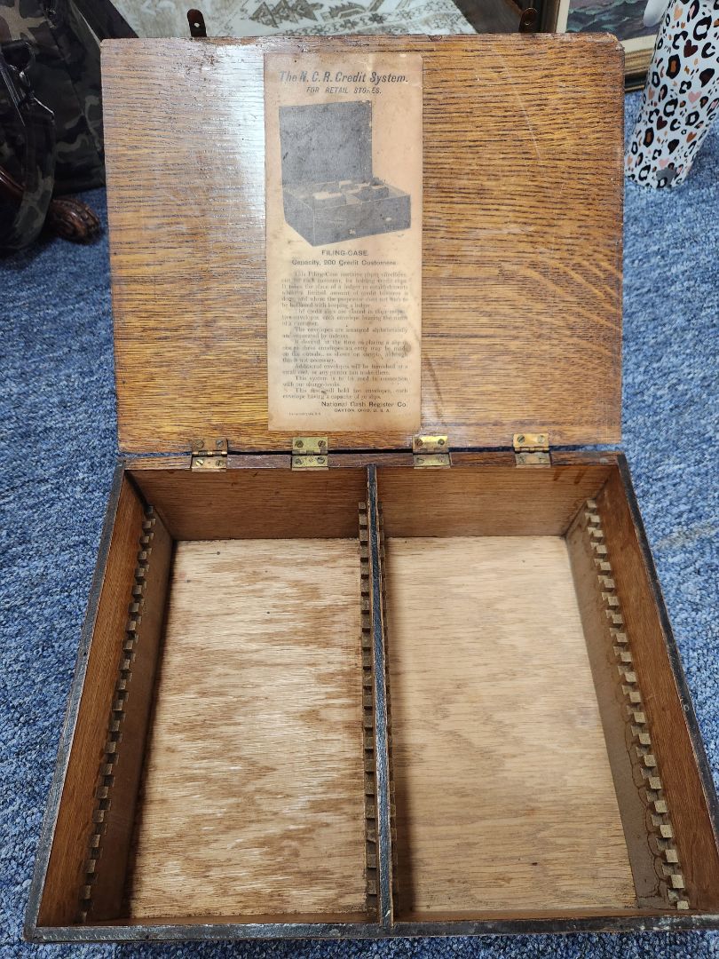 Vintage Wood Credit File w/brass hinges and gold printing on front.